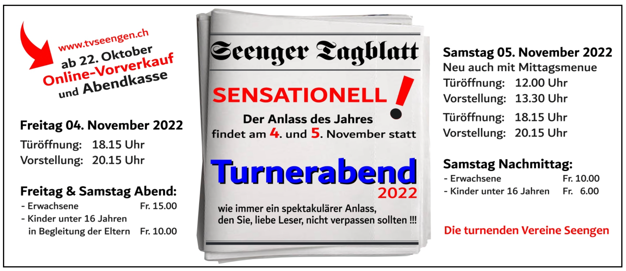Es ist wieder soweit! Die Turnerabende Seengen dürfen wieder stattfinden. Unter dem Motto "Seenger Tagblatt" führen wir mit Tanz, Turnen und Show durch die Vorstellungen und verwöhnen euch mit feinem Essen und kalten Getränken. Den Zuschauern geben wir einen Einblick in den Redaktionsalltag der beliebten Kultzeitung.